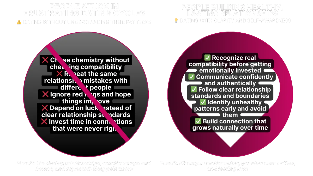 Instead of repeating the same frustrating cycles, you gain a clear framework that helps you date with confidence, choose partners who truly align with you, and build connections that have the potential to grow into lasting relationships.